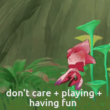 Pari from Genshin Impact floats and plays in a lush green environment, embodying a carefree spirit with the text 'don't care + playing + having fun'.