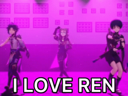 Genshin Impact characters dance in a vibrant pink room, with the text 'I LOVE REN' displayed prominently.