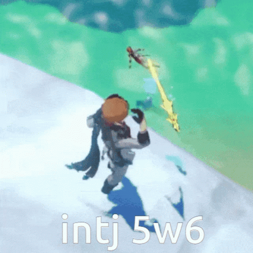 Genshin Impact character Tartaglia (Childe/Ajax) skis down a snowy mountain, with "intj 5w6" text.
