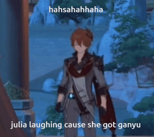 Childe from Genshin Impact in a game scene, with text indicating Julia is laughing after getting Ganyu.