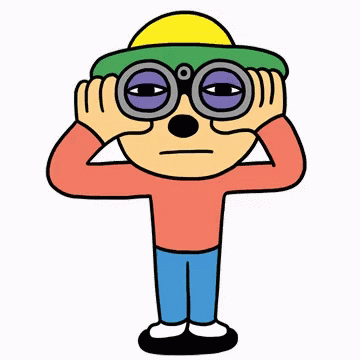 Cartoon character George, wearing a yellow hat, intently looks through a pair of binoculars.