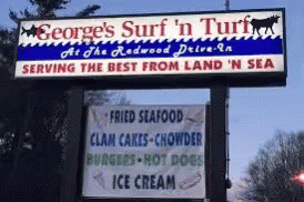 A vintage sign for Georges Surf 'n Turf at the Redwood Drive-In, featuring classic diner style.