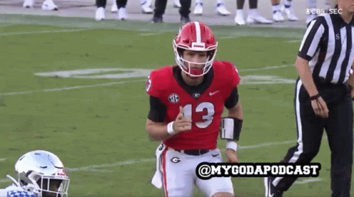 Georgia Bulldogs quarterback Stetson Bennett celebrates with finger guns during a game against the Wildcats.