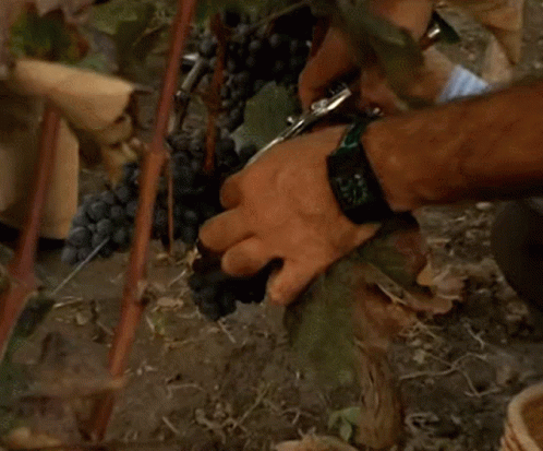 A person's hands carefully harvesting dark Saperavi grapes from a vine in a Georgian vineyard.