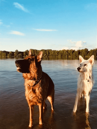 German Shepherds Ciri and Drogon playing and running in shallow water.
