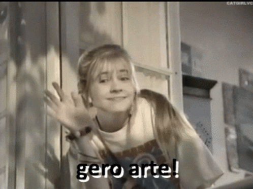 Woman smiling and pointing, wearing a t-shirt with 'gero arte!' text, saying goodbye.