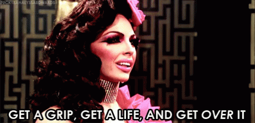 A drag queen delivers the iconic line, 'Get a grip, get a life, and get over it,' with dramatic flair.