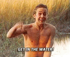 Ryan Gosling, shirtless in water, passionately yells 'GET IN THE WATER!' from the movie The Notebook.