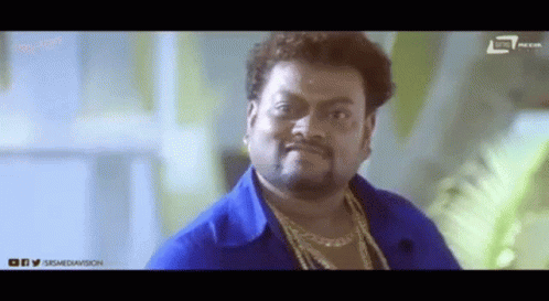 Sadhu Kokila delivers a hilarious 'Get Lost' gesture with an evil grin, wearing a blue shirt and gold chains.