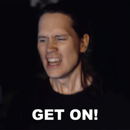 Pellek, the long-haired musician, passionately screams 'GET ON!' with intense energy.