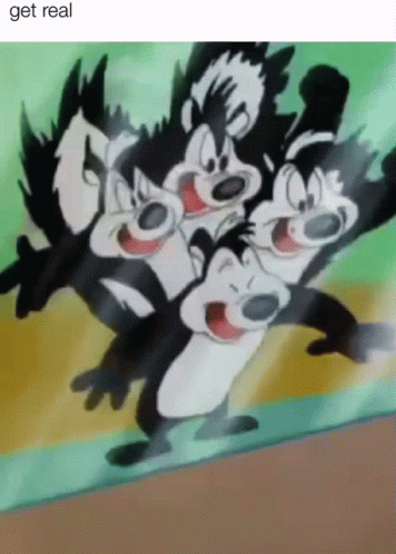 A humorous 'Get Real' meme featuring multiple animated skunks in the style of Pepe Le Pew.