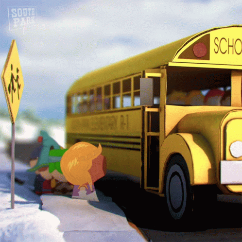 South Park characters Kenny, Kyle, and Cartman board the school bus in a snowy scene from the animated series.