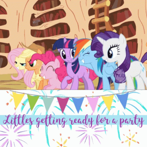 My Little Pony characters are excited and getting ready for a party, with a festive banner.