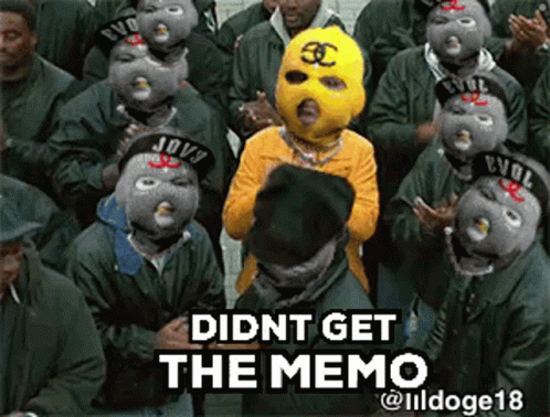 Gevol Kideight stands out in a yellow mask among a group of grey-masked figures, captioned "DIDNT GET THE MEMO."