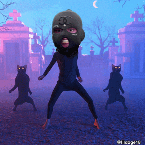 Gevol Kideight dances in a spooky cemetery with black cats under a crescent moon.