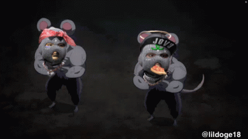 Gevols Kideight features two muscular, hip-hop mice dancing, one eating pizza, in a vibrant animation.