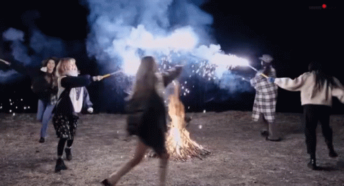 Gfriend Sowon and other members enjoy a night of fireworks and a bonfire, creating bright sparks and smoke.