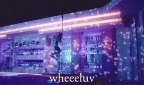 Gfriend Yuju performs a dynamic pole dance in a vibrant purple-lit setting, with 'wheeeluv' text displayed.