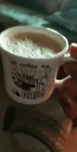 A person holds a white mug filled with foamy coffee, enhanced with pink heart effects.