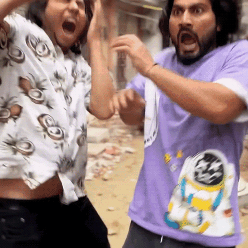 Arshad and another man react with exaggerated shock and surprise on a street.