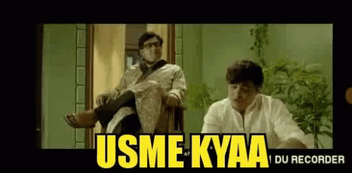 Kashinath Ghanekar and Subodh Bhave in a scene from a Marathi film, with 'USME KYAA' text on screen.