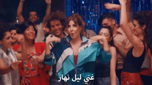 Nancy Ajram energetically dancing at a lively party, surrounded by a cheering crowd, with Arabic captions 'Sing day and night'.