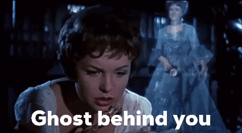 Ghita Nørby looks concerned as a ghost appears behind her in a scene from Baronessen fra Benzintanken.