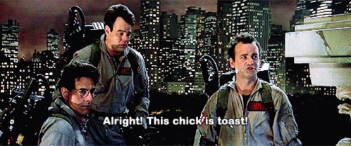 The Ghostbusters team delivers an iconic line against a backdrop of a nighttime city skyline.