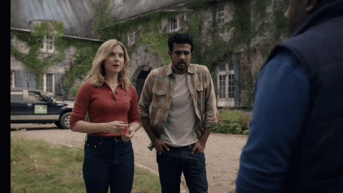 Rose McIver, Utkarsh Ambudkar, and Tristan D Lalla from Ghosts CBS discussing something outdoors.