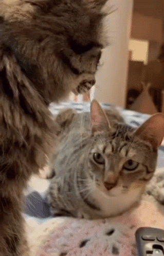 A cat with wide, surprised eyes reacts to something, while another cat rests in the background.