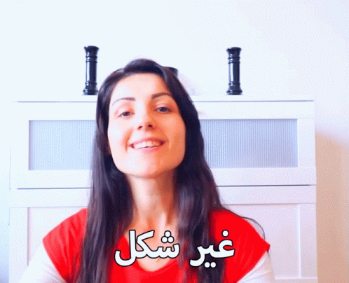 A smiling woman in a red shirt with the Arabic text 'غير شكل' (Different) on her shirt.