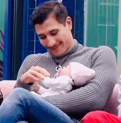 Gianmarco tenderly holds and cuddles a baby, smiling warmly and showing affection.