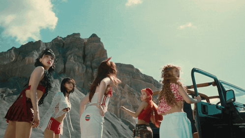 Gidle members Minnie, Miyeon, Shuhua, Soyeon, and Yuqi react with surprise in a desert landscape.