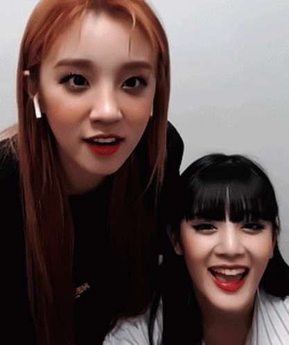 Gidle's Yuqi waves cheerfully alongside Mimi, both smiling brightly for the camera.