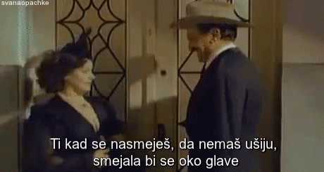 Actors Gidra Bojanic and Zika Pavlovic in a scene, with Zika delivering a humorous line about smiling broadly.