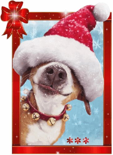 A happy dog wearing a Santa hat and jingle bells, ready for Christmas festivities.