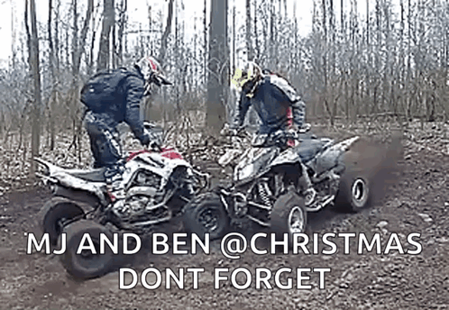 MJ and Ben on their ATVs in the woods, captured around Christmas. Don't forget their adventure!