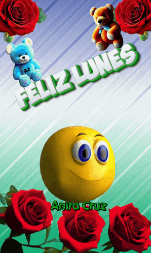 A cheerful animated image wishing a Happy Monday, featuring a smiley face, red roses, teddy bears, and Anita Cruz's name.