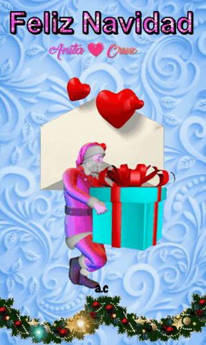Animated Christmas card wishing 'Feliz Navidad' with a Santa-like figure delivering a gift and floating hearts.