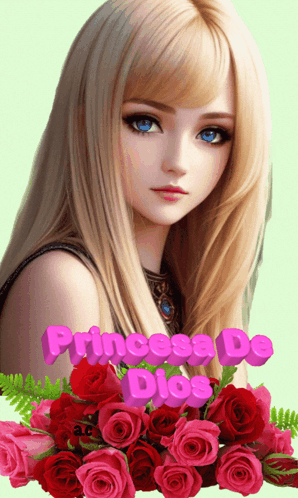 An image of a blonde girl with blue eyes, surrounded by pink roses, with the text 'Princesa De Dios' (Princess of God).
