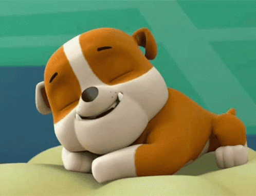 A cute brown and white cartoon dog, Rubble from Paw Patrol, is happily falling asleep with 'Good night' text.