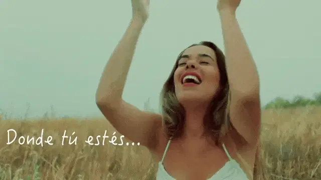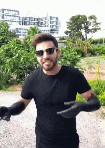 Agoney, wearing sunglasses and long black gloves, smiles and gestures outdoors.