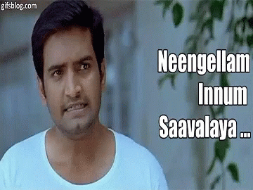 Tamil actor Santhanam makes a frustrated face, asking 'Neengellam Innum Saavalaya...' (Haven't you all died yet?).