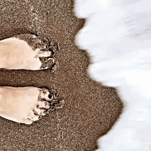 A person's feet with black painted toes stand on a sandy beach as foamy waves wash over them.