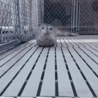 Giggi the seal, also known as The Giggi, rests on a slatted floor inside a fenced enclosure.