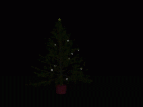 An animated Christmas tree adorned with colorful lights and unique Gigglebees ornaments featuring Wilbur The Coyote.