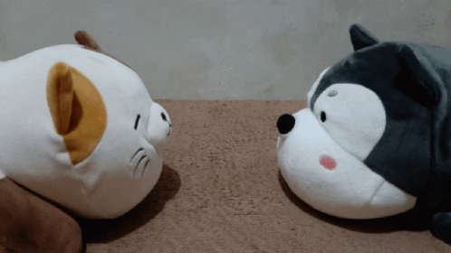 Two adorable stuffed animals, a cat and a dog, are seen nose-to-nose in a cute cuddle.