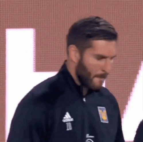 Andre-Pierre Gignac, wearing a black Adidas jacket, looks around on the football field with an intense expression.
