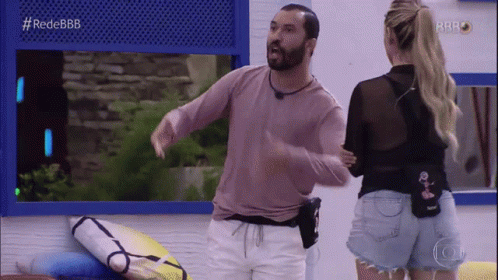 Gilberto Nogueira, known as Gil do Vigor, passionately discusses during Big Brother Brasil 21, gesturing widely.