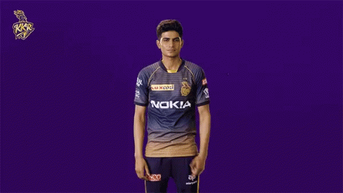 Shubman Gill, the KKR cricketer, strikes a handsome pose in his team jersey against a purple background.